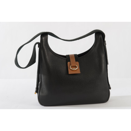 Hermes: borsa in pelle color nero, dettagli color nocciola, tracolla in tessuto (difetti)