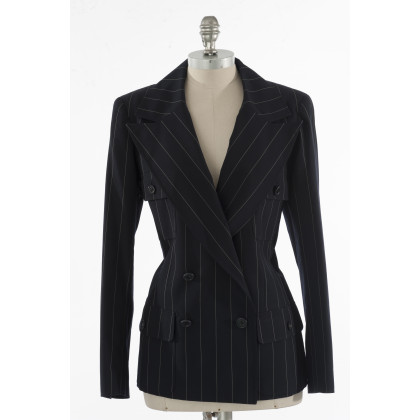 Chanel: tailleur giacca con pantaloni in lana color blu gessato bianco, doppiopetto con bottoni logati, fodera in seta monogrammata (tg 42 francese)