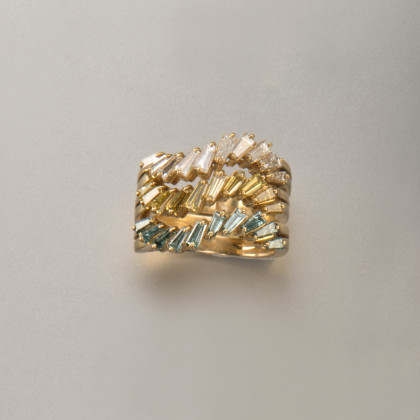 Trittico di anelli in oro giallo con ognuno dieci diamanti taglio tepers di colore giallo, celeste e incolore, totale gr 11,10