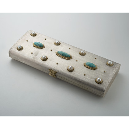 Bella trousse in argento cesellato di forma rettangolare, coperchio con motivi composti da otto perle e tre turchesi taglio cabochon ovali contornati da oro giallo 18kt lavorato a foglie. Specchietto interno e tre scomparti porta trucco e porta rossetto (cm 16x16x2), complessivi gr 354,90