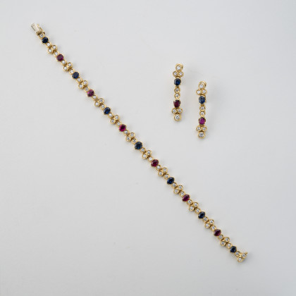 Bracciale e orecchini pendenti a castoncini tondi snodati in diamanti taglio brillante alternati a rubini e zaffiri taglio ovale. Bracciale: diamanti ct 2,00 circa, rubini ct 0,90 circa, zaffiri ct 1,05 circa, gr 19,40; Orecchini: diamanti ct 0,80 circa, rubini ct 0,30 circa, zaffiri ct 0,30 circa, gr 8,00 "En suite" con il lotto n. 74