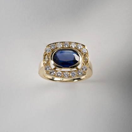 Anello in oro giallo di forma rettangolare con zaffiro centrale taglio ovale sfaccettato di ct 2,30 circa contornato da diamanti taglio brillante a pavé di ct 0,50 circa totali e due zaffiri gialli taglio navette di ct 0,10 circa totali (misura 16) gr 9,10