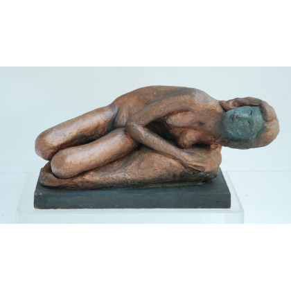 Scultura moderna in terracotta laccata raffigurante donna sdraiata. ( cm 37x20x20) Firmata e datata. Base in legno.