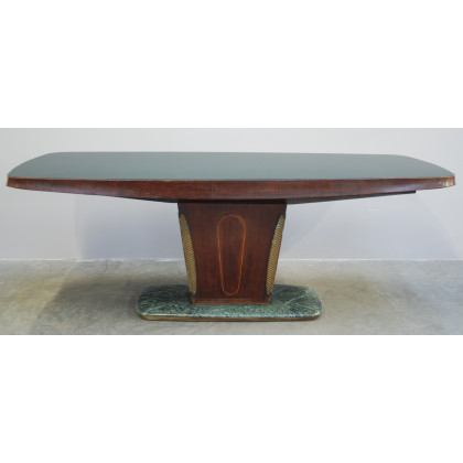 (Attr.) Tavolo da pranzo in legno di palissandro con piano in opalina verde, sostegno centrale decorato con fregi dorati, piano in marmo verde. Varedo, anni '40 del sec. XX (difetti)(cm 218x81x96)