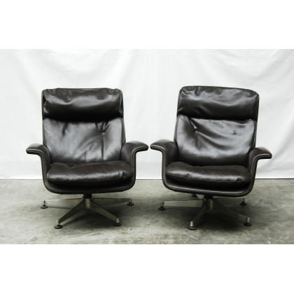 Coppia di poltrone da ufficio rivestite in similpelle e con sostegno in alluminio pressofuso (cm 84x88x100) Produzione Anonima Castelli Bologna, anni '60 (difetti)