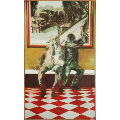 "La stazione" 1966, olio su tela (cm 180x110). Firmato in basso a destra. Firmato e datato 1966 al retro (difetti)