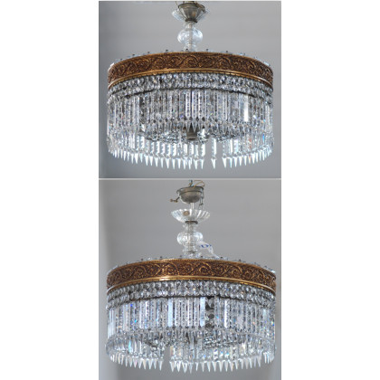 Coppia di lampadari a sei fiamme di forma circolare in bronzo decorato in rilievo e pendagli in vetro (difetti e mancanze)