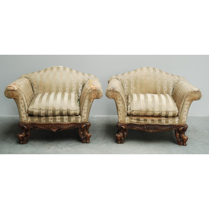 Coppia di poltrone a pozzetto in legno intagliato a volute e motivi vegetali, gambe anteriori a forma di putto accovacciato (difetti)