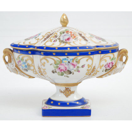 Manifattura di Sevres. Coppa con coperchio in porcellana decorata a fiori in policromia e fregi dorati