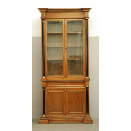 Libreria a due corpi, lastronata in noce con montantia mezza colonna tornita. Parte superiore a due ante a vetri; parte inferiore ad un cassetto, pianetto estraibile e due ante riquadrate. Fine sec XIX (cm 130x267x38)