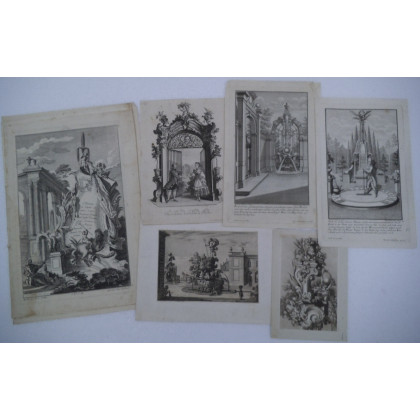(Architettura - Fregi) Lotto di 26 fogli inc. in rame, o eseguiti in litografia, sec. XVII-XIX. Riproducono fregi, ornati, cornici, portali, fontane, ecc. Dimensioni varie. Mende