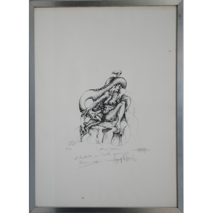 "Storia d'amore" litografia monocroma (cm 70x50) es 7/30. Dedicata, firmata e datata 1979 in basso, in cornice
