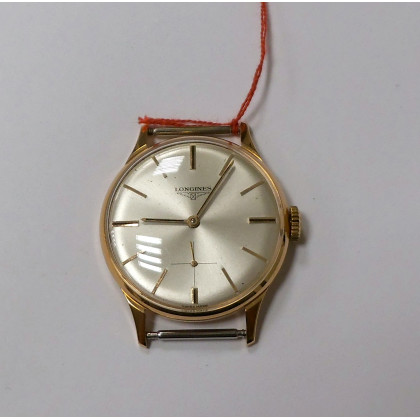 Orologio da polso Longines in oro giallo 18K (senza cinturino). Movimento con carica manuale, solo tempo, quadrante dei secondi al VI. Quadrante silver Circa 1960.