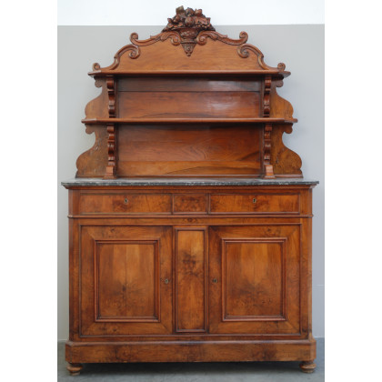 Credenza in noce con alzata a due ante e due cassetti decorati con sagomette in rilievo, piano in marmo grigio, sec. XIX. Alzata con ripiani a giorno (cm 145x220x56)(difetti)