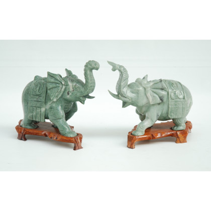 Due sculture in pietra dura raffiguranti elefanti su basi in legno. Cina, sec. XX. (h cm 19) (difetti)