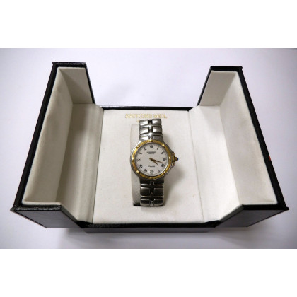 Orologio da polso unisex Raymond Weil in acciaio e oro, modello Parsifal, ref. 9188. Quadrante bianco in XII romani, con datario a ore VI. Bracciale in acciaio. Movimento al quarzo. Circa 1980. Segni di uso. Completo di confezione e maglie aggiuntive per il bracciale.