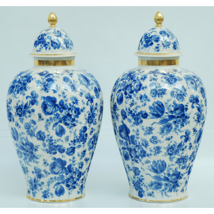 Manifattura tedesca. Coppia di potiches con coperchio in porcellana decorate a fiori blu e dorature su fondo color crema (h cm 42)