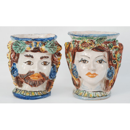 Manifattura di Caltagirone "Saraceni" coppia di vasi figurati in maiolica policroma (lievi difetti)