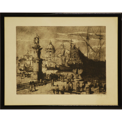 (Venezia) Paolo Mezzanotte. "Scorcio di Venezia con navi alla fonda" acquaforte e acquatinta firmata a matita in basso a destra. Il foglio nel margine inferiore reca il timbro a secco della Società Promotrice della Permanente di Milano. (cm 49x63) In cornice