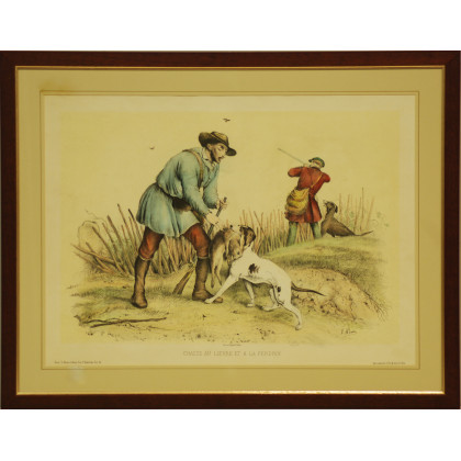 (Caccia) Adam V. "Chasse an lievre et a la perdrix" litografia originale a due toni con particolari acquerellati. Sec XIX (cm 55x72) In cornice