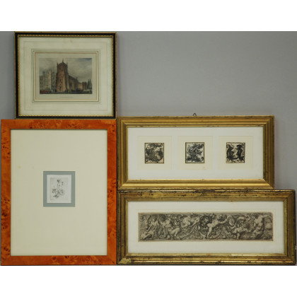 Lotto di quattro stampe di epoche e misure diverse raffiguranti elementi decorativi capolettere e, cattedrale e sirena