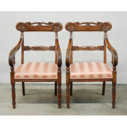 Coppia di poltrone in mogano con schienale e braccioli intagliati, gambe anteriori tornite. Fine sec XIX (Lievi difetti)