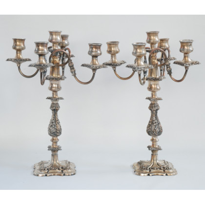 Coppia di candelieri a cinque luci in metallo argentato decorati in rilievo a volute e motivi floreali