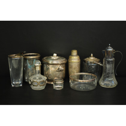 Lotto composto da tre portaghiacio uno shaker, un miscelatore, una bottiglia, un brocca, una vaschetta ed un piccolo contenitore in metallo argentato e vetro (difetti)