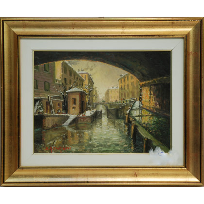 "Milano anni '30. Alla Conca via Senato" olio su tela (cm 30x40) Firmato in basso a sinistra. Firmato e titolato al retro. In cornice