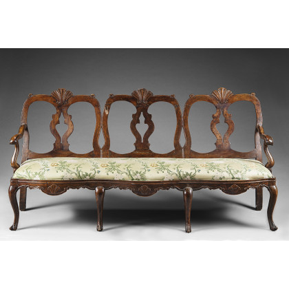 Divanetto a tre posti in noce con schienale a giorno intagliato a conchiglie stilizzate. Fascia sagomata e intagliata, braccioli e gambe mosse. Veneto, sec. XVIII (cm 175x90x55) (difetti e restauri) 18th-century three-seater walnut settee from Veneto (defects and restorations)