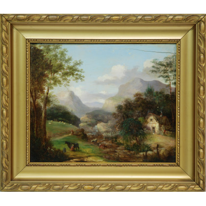 Scuola inglese "Paesaggio con armenti" olio su tavola (cm 30x36) In cornice (difetti)