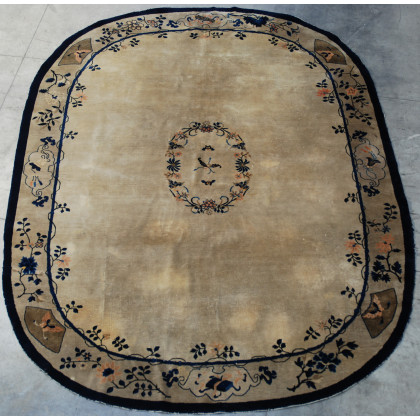 Tappeto Cina Pekino, inizio sec XX di rara forma ovale decorato a motivi floreali in blu su fondo beige (cm 352x268) (difetti)