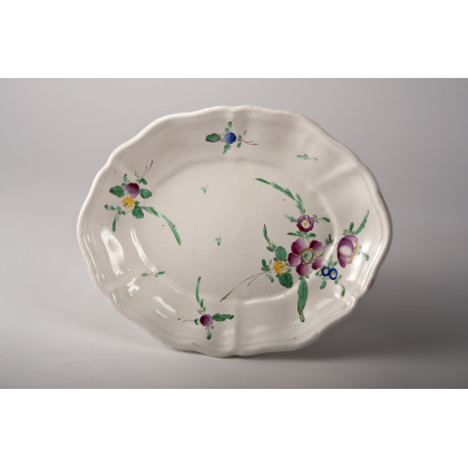 Manifattura di Lodi sec. XVIII. Vassoietto ovale in maiolica a bordo rialzato e sagomato decorato in policromia a mazzetti di fiori. (cm 28x42)