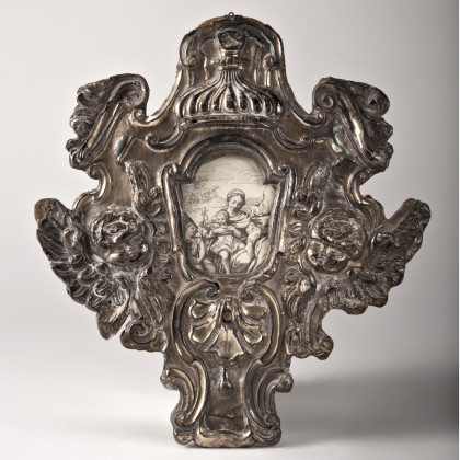 Cartagloria in argento sbalzato a teste di cherubini alati, ventagli, volute e corona. Sec. XVIII.