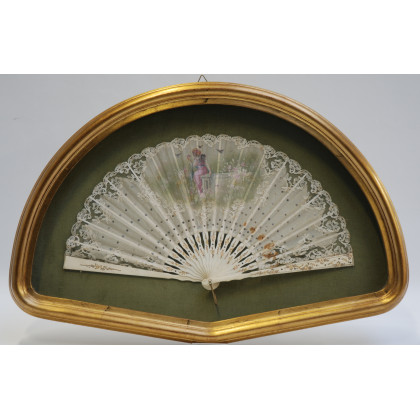 Ventaglio con pagnia in pizzo decorata con figura di gentildonna in un giardino. In teca dorata (difetti)