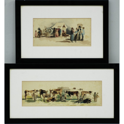 (attr.) "Scene con contadini" due acquerelli di misure diverse, in cornice