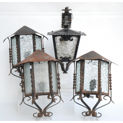 Lotto composto da tre appliques ed una lanterna da insegna in ferro battuto e vetro (difetti)
