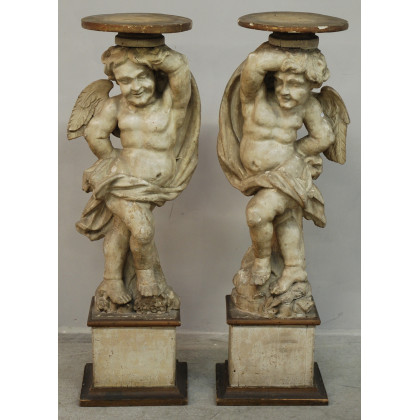 Coppia di sculture in legno laccato raffiguranti cherubini, del sec XVII. Montati a colonna in epoca posteriore (h cm 108)