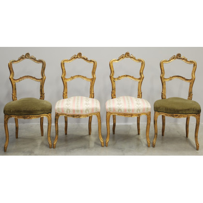 Gruppo di quattro sedie in legno dorato con schienale a giorno e gambe sagomate (difetti)