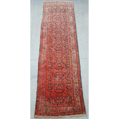 Passatoia orientale decorata a motivi geometrici e fiori stilizzati nei toni del rosso, verde e azzurro (cm 345x96) (difetti)