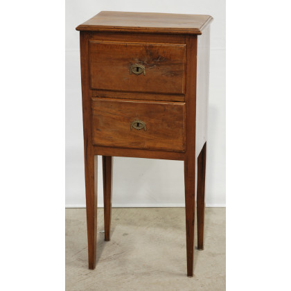 Comodino "Luigi XVI" in noce a due cassetti e quattro gambe rastremate. Sec XVIII, (cm 40x88x28)(difetti)