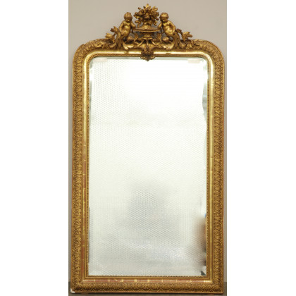 Specchiera verticale in legno e pastiglia dorata decorata a motivi vegetali in rilievo sormontata da figure di putti a tutto tondo e trionfo di fiori. Fine sec XIX (cm 154x83) (difetti)