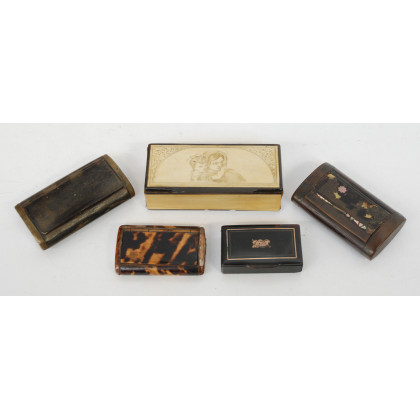 Lotto di cinque scatole porta tabacco in osso, corno e metallo argentato di diversa forma e decoro (difetti)