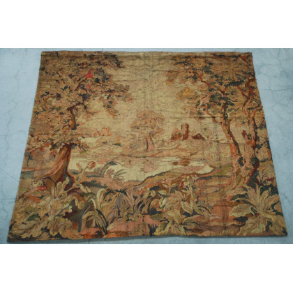 Frammento di arazzo del sec. XIX raffigurante paesaggio con alberi, pappagalli e casette sullo sfondo (cm 206x235)(difetti)