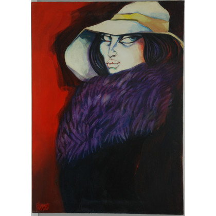 "Donna con cappello e pelliccia" olio su tela (cm 70x50) Firmato in basso a sinistra. In cornice