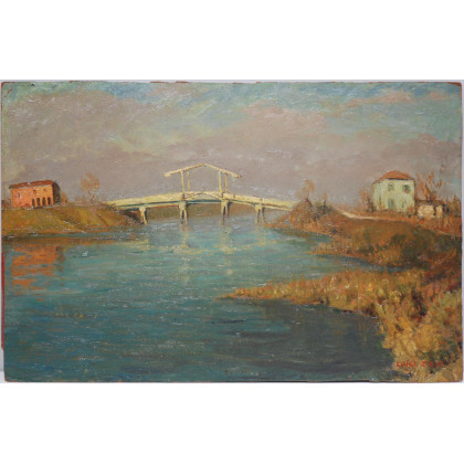 "Il ponte" olio su cartone (cm 44x68) Firmato in basso a destra. In cornice