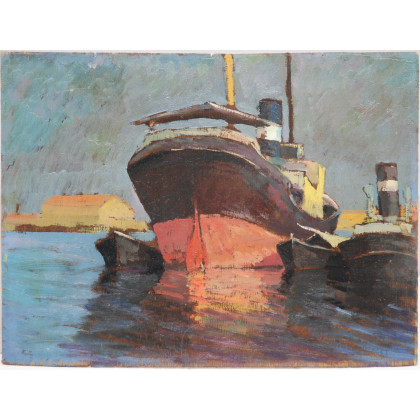 "Porto di Livorno" olio su compensato (cm 23,5x31) Firmato in basso a destra. Al retro: firmato e datato. Etichetta. In cornice