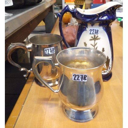 Lotto composto da una brocca in ceramica e due boccali in metallo argentato (difetti)