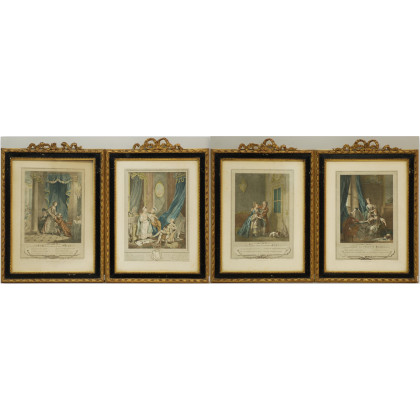 (Stampe francesi) Freudeberg S. (disegnatore). Serie di quattro scene galanti. Incisioni in rame colorite a mano di Voyez l'Aine, Incisioni del sec, XVIII ma in tiratura posteriore. Incorniciate