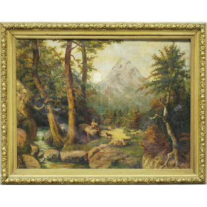 Scuola fine sec XIX, "Paesaggio boschivo con contadini e armenti", olio su tela (cm 125x160), in cornice dorata (difetti)